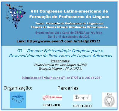 Nos dias 12 a 15/07 será o evento de lançamento do livro Linguística Aplicada na Contemporaneidade: Temáticas & Desafios organizado por Kyria Finardi, Christine Almeida e Gabriel Amorim.